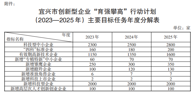 附件:宜興市創(chuàng)新型企業(yè)“育強攀高”行動計劃(2023—2025年)主要目標任務(wù)年度分解表