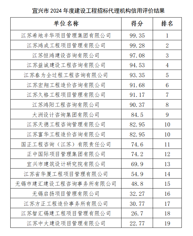 關(guān)于公布宜興市2024年度建設(shè)工程招標(biāo)代理機(jī)構(gòu)信用評(píng)價(jià)結(jié)果的通知