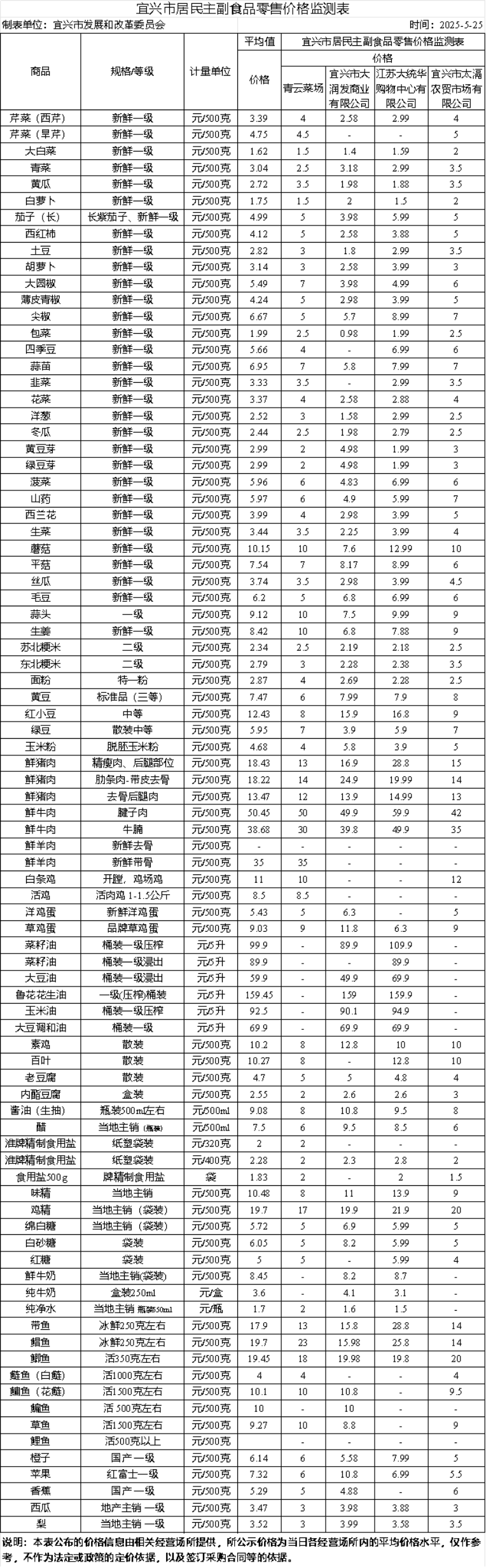 【農(nóng)副產(chǎn)品】宜興市居民主副食品價格監(jiān)測表(2025.5.25)
