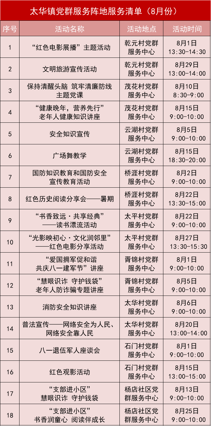8月預(yù)告 | 太華鎮(zhèn)黨群服務(wù)中心活動(dòng)清單